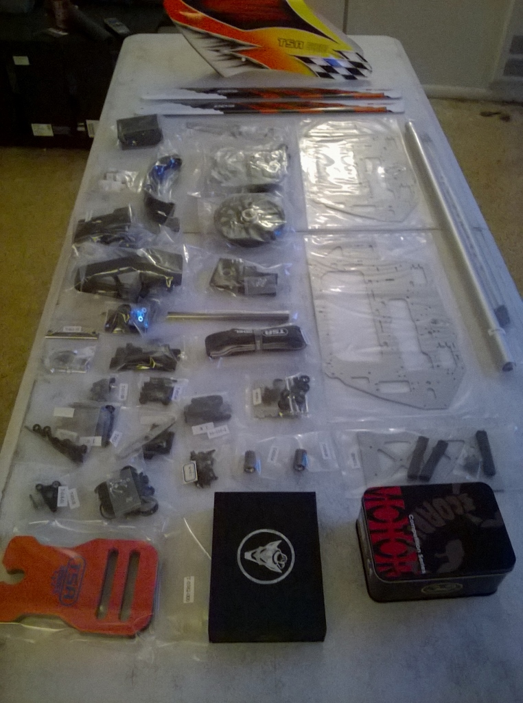 I was speechless. What an awesome husband he is to order me a 600 size helicopter kit for Valentine`s Day. He also ordered a scorpion motor, two extra battery trays, and a set of 6s 5000mAh batteries as well.